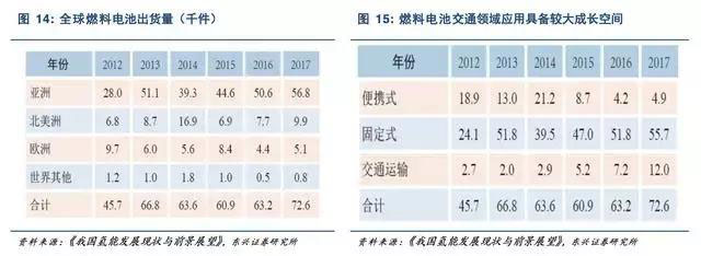 從全球燃料電池出貨量來(lái)看,近年來(lái)呈穩(wěn)步提升態(tài)勢(shì)。2017年全球燃料電池出貨量達(dá)到7.26萬(wàn)件,其中大部分為固定式(主要為燃料電池固定發(fā)電)應(yīng)用,車輛領(lǐng)域成長(zhǎng)迅速,有望成為未來(lái)主流的應(yīng)用場(chǎng)景。