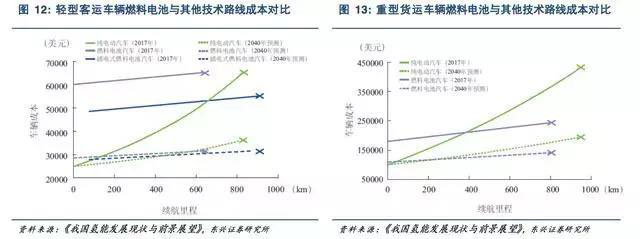 燃料電池功率和儲(chǔ)能單元彼此獨(dú)立,增加能量單元對(duì)車輛成本和車重影響相對(duì)較小,氫燃料電池在重型交通領(lǐng)域相比鋰電池具有更強(qiáng)的技術(shù)適應(yīng)性。隨著車重和續(xù)航的提升,燃料電池汽車成本將逐步接近甚至低于純電動(dòng)汽車。