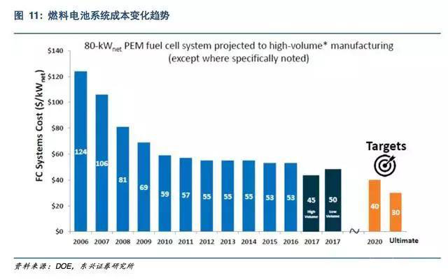 國(guó)外燃料電池技術(shù)進(jìn)步明顯,初步具備商業(yè)化條件。從成本端來(lái)看,國(guó)外燃料電池系統(tǒng)規(guī)模化成本已經(jīng)降至45美元/kW,接近40美元/kW的戰(zhàn)略目標(biāo),根據(jù)DOE的規(guī)劃,到2020年燃料電池系統(tǒng)成本降至40美元/kW以下,最終商用需要成本降至30美元/kW左右。