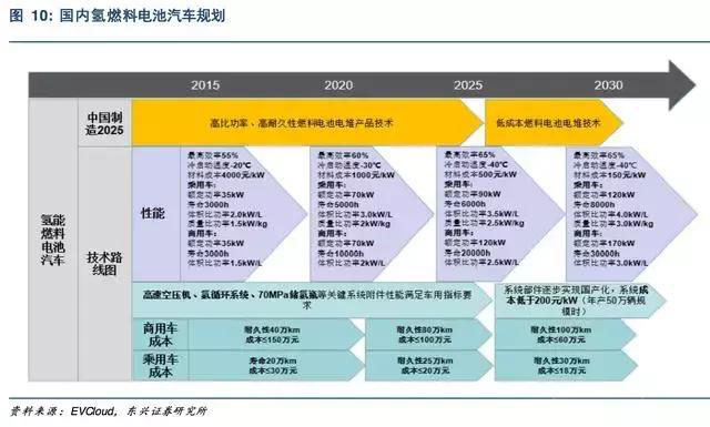根據(jù)此前國(guó)家發(fā)布的燃料電池技術(shù)路線圖,燃料電池產(chǎn)業(yè)要發(fā)展以城市私人用車、公共服務(wù)用車的批量應(yīng)用為主,逐步實(shí)現(xiàn)燃料電池汽車產(chǎn)業(yè)的商業(yè)化推廣。根據(jù)規(guī)劃,氫燃料電池汽車要在2020年實(shí)現(xiàn)5000輛規(guī)模示范應(yīng)用,2025年達(dá)到5萬(wàn)輛的規(guī)劃,2030年實(shí)現(xiàn)百萬(wàn)輛規(guī)模的商業(yè)推廣。