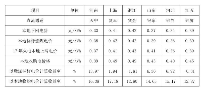 根據(jù)國家能源局關(guān)于2017年度全國電力價格情況監(jiān)管通報,國網(wǎng)2017年電力市場交易信息報告,選取河南省,江蘇省、浙江、山東、上海、河北等省進(jìn)行分析,輸送電量分為水電、火電、新能源和火電打捆。根據(jù)落地省落地電價分別與落地省燃煤標(biāo)桿電價、本省電網(wǎng)電力平均收購電價計算收益率見下表1。