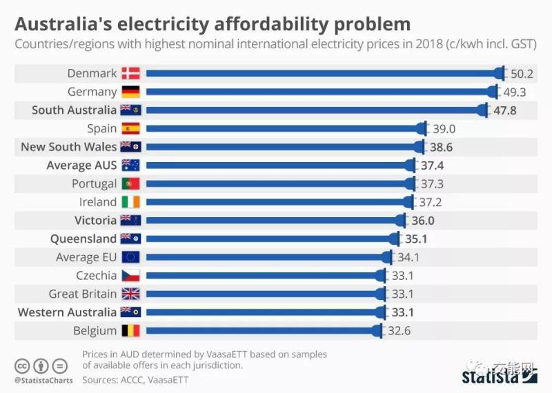 2018年澳大利亞平均民用電價達到0.37澳元每千瓦時,約合0.23歐元每千瓦時。將澳大利亞電價與歐洲國家比較發(fā)現(xiàn),南澳大利亞州的電價處于世界最高電價行列之中,只次于德國和丹麥。而在2004年時澳大利亞還是經(jīng)合組織中電價第四便宜的國家。