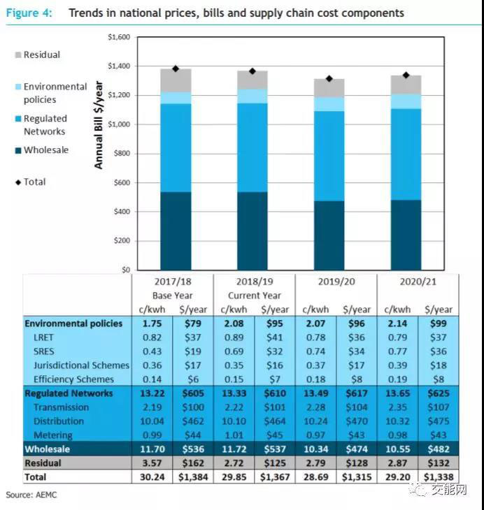上圖展示了10年中澳大利亞民用電價上漲中,各電價組成要素的漲幅百分比,由圖可見: