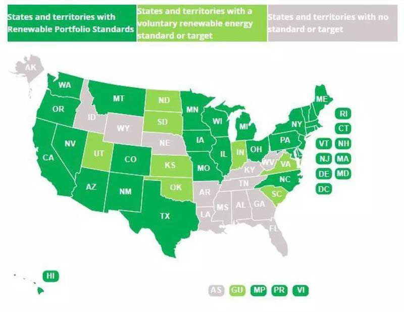 29個(gè)州加上華盛頓特區(qū),目前都制定了有約束力的可再生能源目標(biāo)。8個(gè)州加上華盛頓特區(qū)制定了2017年以來(lái)100%清潔或可再生能源的目標(biāo)。美國(guó)參議院提出立法規(guī)定2035年實(shí)現(xiàn)50%的可再生能源目標(biāo)。