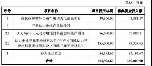 (1)綠色拆解循環(huán)再造車用動力電池包項目;(2)3萬噸/年三元動力電池材料前驅(qū)體生產(chǎn)項目;(3)動力電池三元正極材料項目(年產(chǎn)5萬噸動力三元材料前驅(qū)體原料及2萬噸三元正極材料);(4)補充流動資金項目。