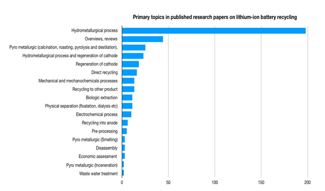 在全球范圍內(nèi),在分離和回收廢舊電池和陰極材料重新利用方面進(jìn)行了300多項初步研究,其中70%的研究是由中國和韓國的電池生產(chǎn)商進(jìn)行的,并發(fā)現(xiàn)所有的活性材料(包括金屬鋰)都可以高效回收。