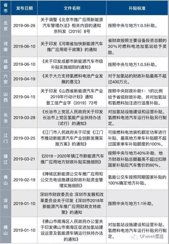 2019年3月26日,四部委發(fā)布《關(guān)于進(jìn)一步完善新能源汽車推廣應(yīng)用財政補貼政策的通知》,通知從2019年3月26日起實施,2019年3月26日至2019年6月25日為過渡期。過渡期期間銷售上牌的燃料電池汽車按2018年對應(yīng)標(biāo)準(zhǔn)的0.8倍補貼。目前過渡期已過,之后的燃料電池補貼政策尚未發(fā)布。OFweek氫能匯總了2019年上半年國內(nèi)的主要燃料電池和加氫站的補貼政策。