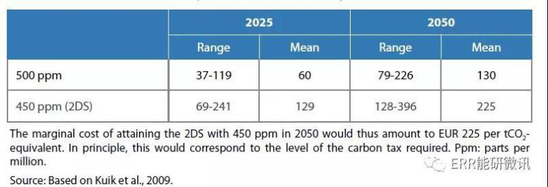 對(duì)大量不同氣候和能源模型中建立的2ds對(duì)應(yīng)的邊際成本進(jìn)行綜合分析,得出了2025年和2050年450和500ppm濃度目標(biāo)的邊際減排成本(MAC)值(見(jiàn)表ES.1)。這些數(shù)值意味著到2025年每噸二氧化碳的成本至少為100美元,到2050年每噸二氧化碳的成本至少為200美元。