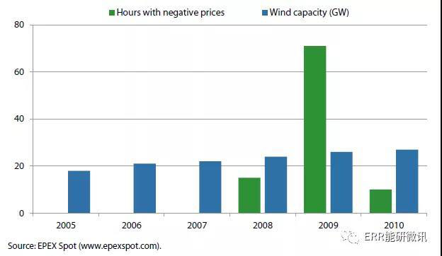 圖1.3 德國(guó)電力市場(chǎng)的風(fēng)電裝機(jī)和負(fù)價(jià)格