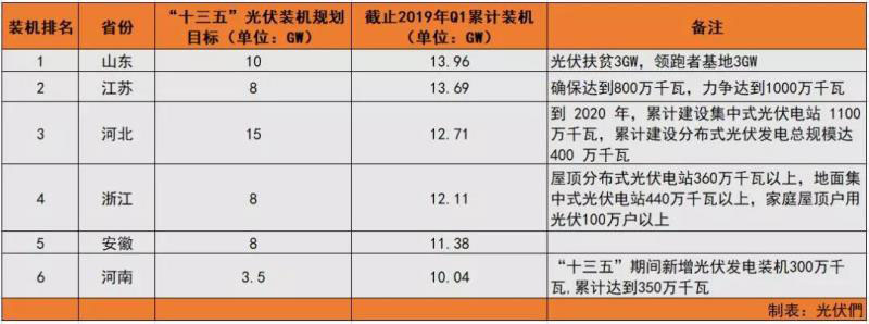 自從西部地區(qū)頻發(fā)限電之后,光伏裝機(jī)的重點(diǎn)便轉(zhuǎn)移至中東部的山東、江蘇、安徽、浙江等地區(qū)。這些地區(qū)工商業(yè)發(fā)達(dá),用電負(fù)荷大,天然具備消納光伏電力的潛力。然而,幾年之后,全國光伏發(fā)電累計(jì)裝機(jī)規(guī)模TOP 5的省份分別為山東、江蘇、河北、浙江以及安徽。新疆、寧夏、青海等曾經(jīng)的光伏“大省”已被遠(yuǎn)遠(yuǎn)拋在后面。從上表可以看出,截止2019年第一季度,上述六個中東部省份的光伏裝機(jī)規(guī)模已占全國總裝機(jī)的40%左右。