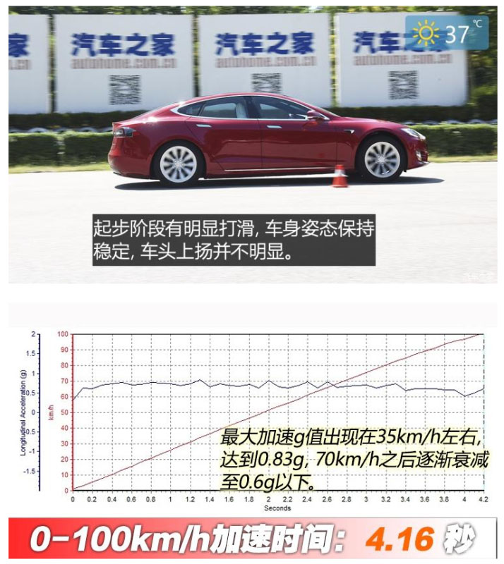 小結:受測試當天環(huán)境所限沒能取得官方3.8s的加速成績,即便如此2019款特斯拉Model S長續(xù)航版還是表現(xiàn)出了相當不俗的加速性能;而對于其比較一般的制動成績而言,更換一套側重抓地性能的輪胎應該是最直接簡單的解決方案。