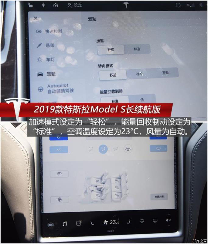 Model S的舒適性還體現(xiàn)在能量回收的設定上,同樣是兩擋設定,“低”擋位下松開加速踏板并不會有明顯的拖拽感,動能回收力度柔和細膩;“標準”模式下拖拽感及減速效果會更強,但也在可接受范圍內,不至于讓人有不適之感。