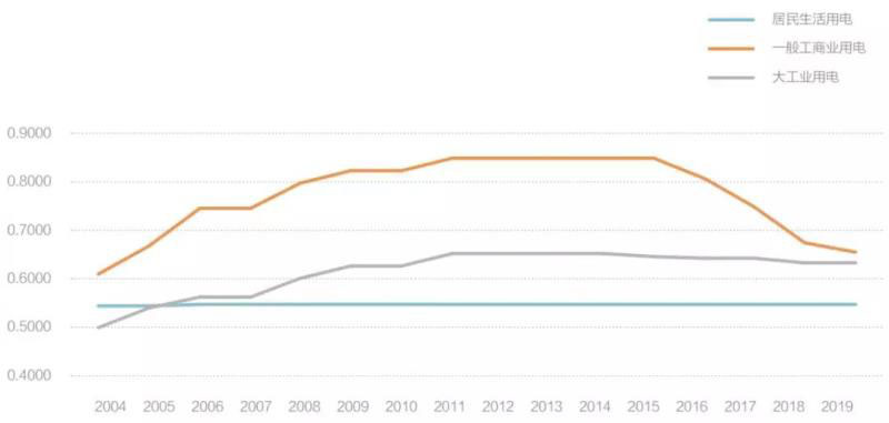 即使需要補貼居民電價和農(nóng)業(yè)電價帶來的電費缺口,2018年和2019年中國還是連續(xù)兩年每年降低了10%的工商業(yè)電價,給用電企業(yè)減負。瞅瞅這電價曲線圖,一目了然——