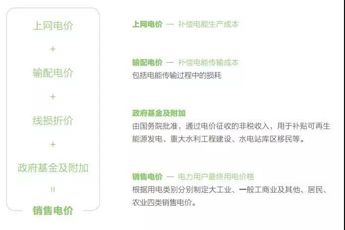 我們交電費時的電價叫做“銷售電價”。它由上網(wǎng)電價、輸配電價、線損折價、政府基金及附加4部分組成。