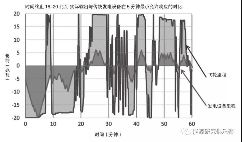 2011年美國(guó)能源管理委員會(huì)(FERC)頒布了第755號(hào)命令,要求其管轄的各大批發(fā)電力市場(chǎng)對(duì)傳統(tǒng)輔助服務(wù)產(chǎn)品中調(diào)頻服務(wù)的報(bào)償機(jī)制進(jìn)行改革。FERC認(rèn)為傳統(tǒng)調(diào)頻服務(wù)的補(bǔ)償機(jī)制未有效體現(xiàn)提供調(diào)頻服務(wù)中快速反應(yīng)產(chǎn)品的價(jià)值,這對(duì)于快速反應(yīng)的產(chǎn)品不公平。如圖4所示,飛輪技術(shù)和傳統(tǒng)發(fā)電設(shè)備同時(shí)提供20兆瓦的調(diào)頻,但是飛輪技術(shù)可以更快地對(duì)系統(tǒng)的信號(hào)進(jìn)行反應(yīng),更準(zhǔn)確地提供系統(tǒng)所需要的服務(wù)來(lái)幫助調(diào)頻。FERC755號(hào)令要求其管轄內(nèi)的區(qū)域電力市場(chǎng)要按照“基于里程”的方式來(lái)對(duì)提供調(diào)頻服務(wù)的產(chǎn)品提供補(bǔ)償,即補(bǔ)償不光要基于調(diào)頻服務(wù)的容量,還要包括其跟隨調(diào)度信號(hào)向上向下行走的總“距離”18。