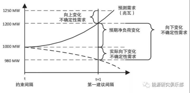 2016年,CAISO在其15分鐘和5分鐘的實(shí)時(shí)市場(chǎng)引入了一種新的輔助服務(wù)產(chǎn)品“靈活爬坡產(chǎn)品”(FRP)。靈活爬坡產(chǎn)品FRP用來(lái)應(yīng)對(duì)系統(tǒng)凈負(fù)荷(原負(fù)荷減去風(fēng)力發(fā)電量減去太陽(yáng)能發(fā)電量)變化的兩個(gè)原因:預(yù)期的凈負(fù)荷變化和預(yù)期之外不確定性的凈負(fù)荷變化。和傳統(tǒng)的輔助服務(wù)產(chǎn)品不同,這種產(chǎn)品的需求和規(guī)格不是根據(jù)系統(tǒng)某一個(gè)時(shí)刻的狀態(tài)而定,而是依據(jù)兩個(gè)時(shí)間點(diǎn)的變化而定。例如,下圖所示的凈負(fù)荷在時(shí)間點(diǎn)t和t+1預(yù)期變化為200 兆瓦(從1000兆瓦到1200兆瓦),向上變化不確定性需求為50兆瓦(從1200兆瓦到1250兆瓦)。該時(shí)間間隔的向下總不確定性需求為220兆瓦(從1200兆瓦到980兆瓦),但因?yàn)轭A(yù)期凈負(fù)荷變化為200兆瓦,因此,實(shí)際向下變化不確定性需求為20兆瓦(220兆瓦減去200兆瓦)?。