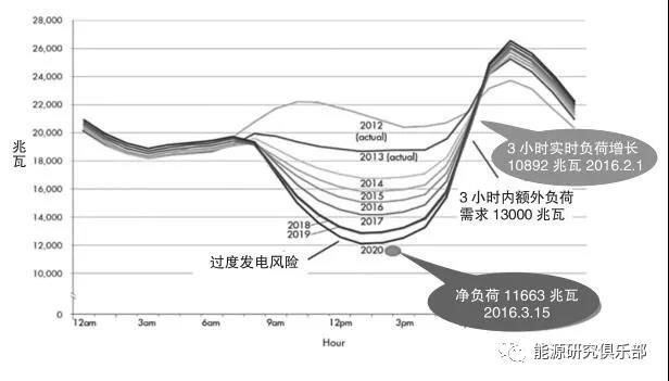 間歇性可再生能源的大量滲透,尤其是太陽(yáng)能,對(duì)加州的電力系統(tǒng)帶來(lái)了很大的挑戰(zhàn)。下圖是加州批發(fā)電力市場(chǎng)運(yùn)營(yíng)系統(tǒng)CAISO從2012年到2020年實(shí)際和預(yù)測(cè)的在某一日的凈負(fù)荷變化。由于太陽(yáng)能在白天的出力迅速增加,在中午12時(shí)~下午3時(shí)系統(tǒng)的凈負(fù)荷變得很低,這時(shí)系統(tǒng)面臨非常大的出力過(guò)多風(fēng)險(xiǎn)。但在下午3時(shí)~7時(shí)左右,因?yàn)樘?yáng)能的出力迅速降低,系統(tǒng)凈負(fù)荷迅速增長(zhǎng),系統(tǒng)又面臨沒(méi)有足夠的資源來(lái)滿足出力增長(zhǎng)的需求。凈負(fù)荷在一天之內(nèi)這樣大幅度變化充分說(shuō)明加州需要有非常靈活的資源來(lái)及時(shí)的應(yīng)對(duì)風(fēng)電和太陽(yáng)能帶來(lái)的變化。