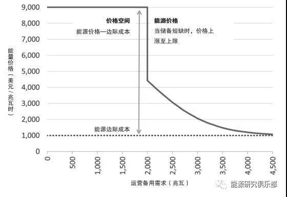 ERCOT在每個(gè)季節(jié)對(duì)于這兩種輔助服務(wù)產(chǎn)品都分別制定出6條ORDC曲線,即把每天24小時(shí)按每4小時(shí)分成一個(gè)時(shí)段,共6個(gè)時(shí)段。對(duì)每個(gè)時(shí)段,ERCOT對(duì)系統(tǒng)在一定儲(chǔ)備量的情況下估算負(fù)荷損失概率,然后將負(fù)荷損失概率乘以損失負(fù)荷的價(jià)值(在ERCOT這個(gè)損失負(fù)荷的價(jià)值是9000美元/兆瓦時(shí))從而得到ORDC曲線。輔助服務(wù)產(chǎn)品的價(jià)格是ORDC的曲線減去邊際能量市場(chǎng)的價(jià)格。如下圖所示,當(dāng)儲(chǔ)備過(guò)剩時(shí),由于負(fù)載損失概率較低,儲(chǔ)備的價(jià)格很低,接近零。當(dāng)儲(chǔ)備短缺時(shí),由于負(fù)載損失很高,價(jià)格很高。當(dāng)儲(chǔ)備少于2000兆瓦時(shí),電力市場(chǎng)的價(jià)格就會(huì)達(dá)到市場(chǎng)價(jià)格的最大值9000美元/兆瓦時(shí)。假設(shè)當(dāng)時(shí)市場(chǎng)的能源邊際成本是1000美元/兆瓦時(shí)的話,這意味著提供輔助服務(wù)的資源可以得到8000美元/兆瓦時(shí)的價(jià)格。