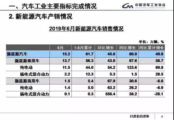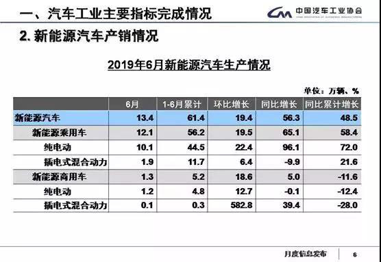 7月10日,中國(guó)汽車工業(yè)協(xié)會(huì)發(fā)布2019年汽車工業(yè)經(jīng)濟(jì)運(yùn)行情況。其中,在新能源汽車市場(chǎng),6月實(shí)現(xiàn)產(chǎn)銷量分別13.4萬、15.2萬輛,同比增長(zhǎng)56.3%、80%;1-6月實(shí)現(xiàn)產(chǎn)銷量61.4萬輛、61.7萬輛,同比增長(zhǎng)48.5%、49.6%。