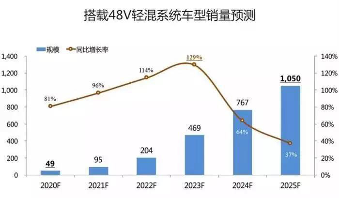 “48V 輕混系統(tǒng)將在中國迎來爆發(fā)式的增長,并最終站到市場 "C 位 " 上。這是全球信息提供商 IHS Markit 最新發(fā)布的數(shù)據(jù)成果。數(shù)據(jù)顯示,48V 輕混將在中國迎來高速發(fā)展期,并在 2020 年至 2025 年的五年時(shí)間里,實(shí)現(xiàn)年均增長率 85%,年銷售量從 49 萬臺(tái)增長到 1050 萬臺(tái)。其中,2023 年市場增速最快,較上一年同比增長 129%,此后,市場增速趨穩(wěn)?!?
