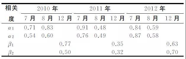 通過梳理廣東省34個氣象站2010~2012年的氣溫?cái)?shù)據(jù),分析氣溫和日負(fù)荷率、日最小負(fù)荷率的相關(guān)性。在排除節(jié)假日、周末等因素的影響后,發(fā)現(xiàn)7、8、12月的日負(fù)荷率及日最小負(fù)荷率與氣溫的相關(guān)程度一般高于其他月份(表3)。其中,7、8月的日負(fù)荷率與日平均氣溫的相關(guān)度α1較高,而最小日負(fù)荷率與日平均最低氣溫的相關(guān)度α2較高;12月的日負(fù)荷率及日最小負(fù)荷率與日平均最高氣溫有一定的相關(guān)性,相關(guān)度為β1、β2。由表3可知,7、8、12月的日負(fù)荷率及日最小負(fù)荷率與氣溫的相關(guān)度基本都高于0.5,為顯著相關(guān)。其中2011年8月受錯峰影響,相關(guān)度有所下降;12月受寒潮影響,月內(nèi)氣溫起伏較大,導(dǎo)致相關(guān)度較低。一般來說,8月的氣溫越高,負(fù)荷水平越高,特別是晚間的負(fù)荷水平增加明顯,使得日負(fù)荷率和日最小負(fù)荷率較高;12月溫度較低,會使高峰時段降溫負(fù)荷有所增加,日最大負(fù)荷相對升高,導(dǎo)致日負(fù)荷率和日最小負(fù)荷率降低。