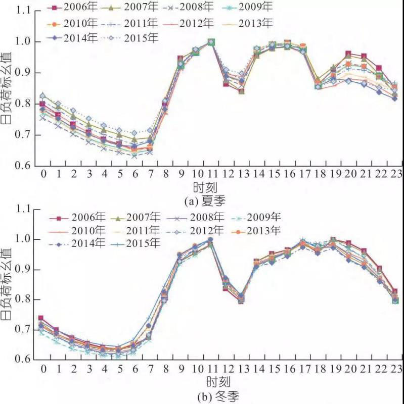 2006~2015年廣東電網(wǎng)夏季與冬季典型日負(fù)荷曲線見圖3。由圖3可知,廣東電網(wǎng)夏季和冬季典型日負(fù)荷曲線在各年份呈現(xiàn)的形狀一致性很高;夏、冬兩季日負(fù)荷曲線形狀基本一致,每天存在三峰三谷,兩者僅晚上負(fù)荷曲線略有不同。夏季典型日最高峰通常出現(xiàn)在11:00左右,低谷負(fù)荷出現(xiàn)在早上6:00 左右,日最小負(fù)荷率在0.63~0.71之間。冬季典型日負(fù)荷早高峰統(tǒng)一出現(xiàn)在11:00左右,若溫度較低,由于晚間保溫負(fù)荷的增加,晚高峰為全天高峰;低谷負(fù)荷出現(xiàn)在凌晨5:00左右,同時也是日最小負(fù)荷,日最小負(fù)荷率在0.61~0.65之間,低于夏季典型工作日最小負(fù)荷率。
