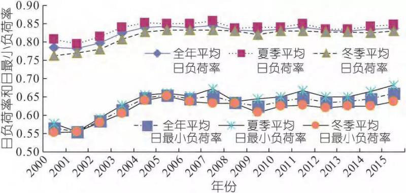 2.2 年平均日負(fù)荷率、日最小負(fù)荷率日負(fù)荷率是日平均負(fù)荷與日最大負(fù)荷的比值,反映負(fù)荷一天內(nèi)的平穩(wěn)程度;日最小負(fù)荷率是日最小負(fù)荷與日最大負(fù)荷的比值,反映負(fù)荷一天內(nèi)的變化幅度。2000~2015年廣東電網(wǎng)年平均日負(fù)荷率、年平均日最小負(fù)荷率見圖2。由圖2可知,近5年來廣東電網(wǎng)全年平均日負(fù)荷率維持在0.83~0.84,平均日最小負(fù)荷率在0.64~0.66之間。夏季與冬季平均日負(fù)荷率變化趨勢相同,僅變化程度略有差異。夏季因受制冷負(fù)荷的影響,日負(fù)荷率與日最小負(fù)荷率均稍高于冬季。