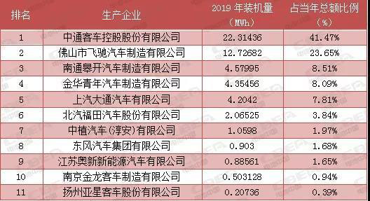 2019年上半年,中通客車與佛山飛馳繼續(xù)領(lǐng)銜,兩家公司的裝機(jī)量合計(jì)達(dá)到上半年我國燃料電池汽車裝機(jī)總量的65.12%。南通皋開汽車制造有限公司悄然崛起,以微弱優(yōu)勢(shì)占得第3席位。金華青年汽車制造有限公司、上汽大通汽車有限公司則分列第4、第5名。