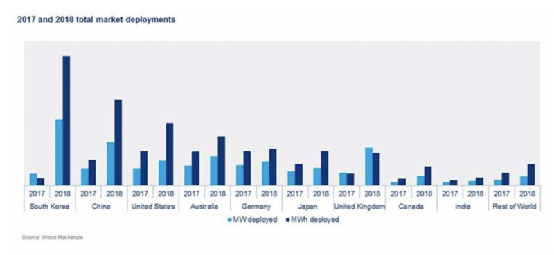 Wood Mackenzie公司指出,中國政府在儲能領(lǐng)域的積極政策激勵是促進(jìn)該行業(yè)快速增長的主要原因,也是儲能部署的主要推動力。中國2018年部署的儲能容量為580MW/1.14GWh,儲能市場規(guī)模累計達(dá)到1.07GW/1.98GWh,并且已經(jīng)確立其在亞太地區(qū)第二大儲能市場的地位。而在儲能部署方面,韓國在亞太地區(qū)仍名列首位。Wood Mackenzie公司對于中國2018年儲能市場增長進(jìn)行的評論說,“中國電網(wǎng)側(cè)(FTM)儲能部署大幅增長,與2017年相比,2018年裝機(jī)容量增長了五倍。”