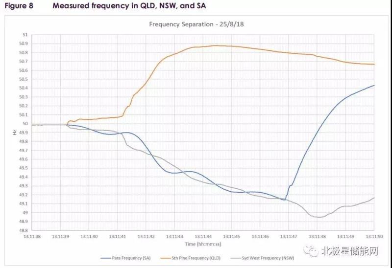 下圖受此次事故影響的三個地區(qū)對比可知,藍(lán)色線配置儲能系統(tǒng)的南澳大利亞州7秒內(nèi)頻率開始恢復(fù)、遭受事故影響較輕,報(bào)告分析結(jié)果也從側(cè)面反映了儲能系統(tǒng)在電網(wǎng)事故中強(qiáng)大的瞬時響應(yīng)和輔助調(diào)頻能力。