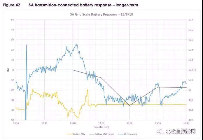 在事故發(fā)生的情況下,南澳大利亞州的大規(guī)模電池儲能提供了多種服務(wù),其價值得到體現(xiàn),包括最初的一次調(diào)頻,然后迅速從輸出發(fā)電狀態(tài)轉(zhuǎn)換為負(fù)載,以阻止南澳大利亞州與維多利亞斷網(wǎng)后的頻率升高情況發(fā)生。