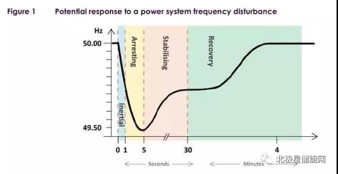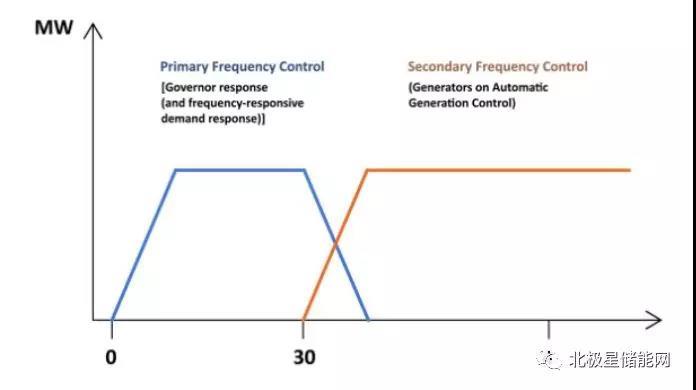 根據(jù)對頻率干擾(如大型發(fā)電機(jī)停運(yùn))的潛在響應(yīng)時間,這些反應(yīng)和控制的示例如下圖所示: