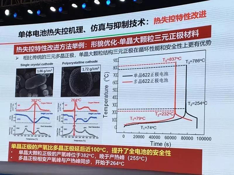 這里只展示其中一種方法,對正極材料的形貌優(yōu)化,將傳統(tǒng)三元多晶正極優(yōu)化為單晶大顆粒結(jié)構(gòu)的三元正極,單晶正極的產(chǎn)氧比多晶正極延后了100℃,熱失控最高溫度也有所降低。