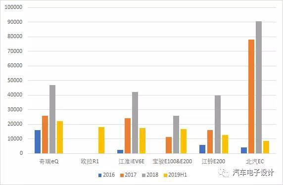 如下圖來看,我們看到了隨著2016=>2018年高速增長之后,到了2019年上半年,這個細(xì)分車的市場需要重新定位。2018 年銷量最多的為北汽 EC 系列、奇瑞小螞蟻、江鈴 E200、眾泰云 E200 等車型。目前市 場正常銷售的 A00 車型主要有奇瑞小螞蟻、江淮 IEV6、長城歐拉 R1,北汽把EC為主的戰(zhàn)略切換到了EU系列為主的出租車和網(wǎng)約車市場。