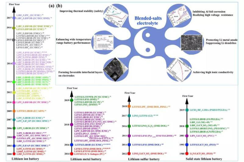 在這篇綜述中,作者將詳細(xì)闡述由LIBs和其他電池(如LMBs、Li-S電池、固態(tài)鋰電池)詳細(xì)分類的混合鹽電解質(zhì)的發(fā)展(圖1a),同時也考慮了電解液溶劑的研究進(jìn)展。作者初步總結(jié)了鋰電池混合鹽電解質(zhì)的研究目的:提高電池的熱穩(wěn)定性(安全性)、抑制正極集流體的鋁箔腐蝕、提高電池的寬溫范圍(或高溫、低溫)性能、提高電池的耐腐蝕性、兩側(cè)電極上形成良好的界面層,保護鋰金屬負(fù)極,實現(xiàn)高離子導(dǎo)電性等(圖1b)。