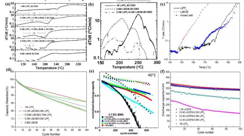 對于LiPF6基混合鹽電解質(zhì)而言,通過向電解質(zhì)中引入熱穩(wěn)定的主鋰鹽(如LiBOB、LiPF3(CF2CF3)3(LiFAP)、LiBF4、四氟草磷酸鋰(LiP4(C2O4)、LiF4OP)、LiFOB、LiTFSI和LiFSI等),LiPF6基電解質(zhì)的熱穩(wěn)定性(安全性)將得到改善。