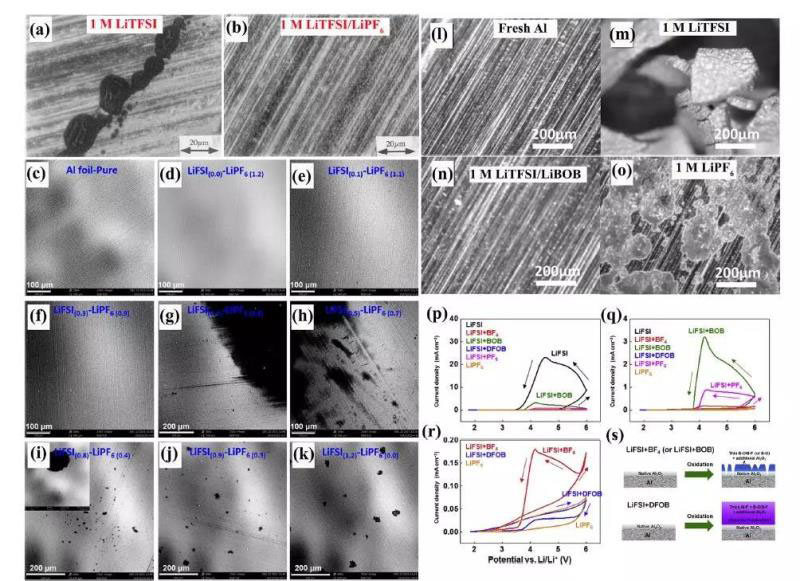 除LiPF6外,硼酸鋰(如LiBF4、LiBOB和LiDFOB)同樣可以抑制LiTFSI和LiFSI酰亞胺對鋁箔的腐蝕。早在2004年,有報道稱通過添加LiBF4(至少0.2 M),通過形成含有RCO2 M(M=Al和/或Li)、草酸鋰、LiOH和不溶性Al(BF4)3的穩(wěn)定鈍化層,可以明顯抑制鋁與基于LiTFSI(EC/DMC)電解質(zhì)中的Al[N(SO2CF3)2]3-Y(OH)Y副產(chǎn)物的嚴(yán)重點蝕。在60℃的高溫下,鋁在LiTFSI材料中的腐蝕被LiBOB電解質(zhì)完全抑制(圖3l-o)。之后,通過比較循環(huán)伏安法得到的電流密度,在LiPF6、LiBF4、LiBOB和LiDFOB的共鹽中,LiDFOB是LiFSI電解質(zhì)中最好的鋁緩蝕劑(圖3p-r)。抑制作用強LiDFOB在LiFSI電解質(zhì)中的抗鋁腐蝕能力歸因于LiDFOB衍生的由Al-F、B-O/B-F和Al2O3組成的厚表面層(圖3s)。