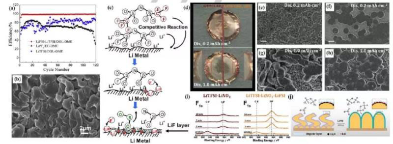 除了鋰離子電池,作者還總結(jié)了其他類型電池電解質(zhì)研究進(jìn)展。鋰金屬電池是采用插層式正極和鋰金屬負(fù)極組成的,長期以來受到鋰/電解質(zhì)界面不穩(wěn)定(體積膨脹和粉碎)和鋰電鍍/剝離過程中嚴(yán)重的鋰枝晶生長的阻礙。近年來,混合鹽電解質(zhì)在鋰金屬保護和高性能低分子篩開發(fā)方面引起了人們極大的興趣,取得了很大進(jìn)展。將LiFSI共鹽加入到LiFSI基電解質(zhì)中,形成0.5 M LiFSI/0.5 M LiTFSI(DOL/DME)混合電解質(zhì),可顯著提高鋰沉積/溶解過程的庫侖效率(約99 %,0.25 mA cm-2)(圖4a)。在10 mA cm-2的高電流密度下,仍然可以避免鋰枝晶(圖4b)。結(jié)果表明,F(xiàn)SI對鋰金屬的反應(yīng)性遠(yuǎn)高于TFSI,并且優(yōu)先形成一個SEI層來保護鋰金屬(圖4c)。H. S. Zhou報道了一種高濃度LiTFSI/LiFSI(DME/DOL)為基的電解質(zhì),并輔以LiNO3為添加劑。添加的LiFSI共鹽顯著增強了鋰離子轉(zhuǎn)移過程,并顯示出均勻的鋰沉積(圖4d-h)。有人提出LiFSI和LiNO3分別對形成SEI成分的LiF和Li2O有利(圖4i-g)。