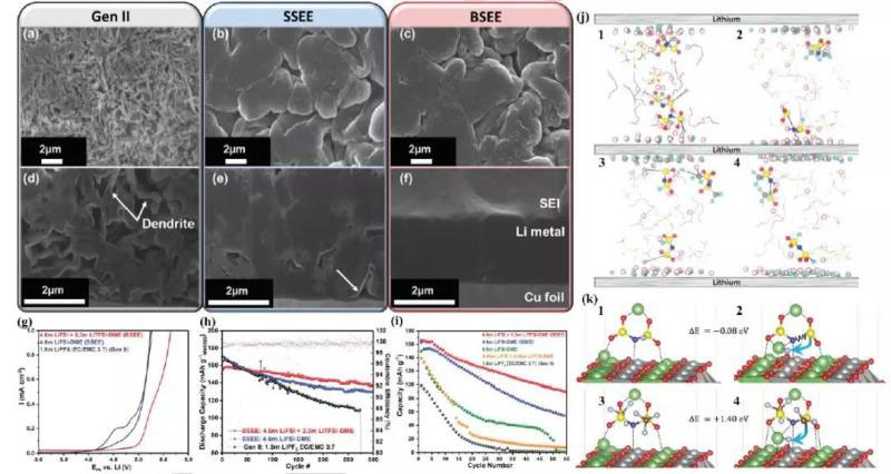 為了使鋰金屬沉積具有更致密、更規(guī)則的形態(tài)(圖5a-f),K.Xu等人研究了高濃度混合鹽電解質(zhì)(在DME中4.6 M LiFSI+2.3 M LiTFSI)。而基于LiNi0.6Nn0.2Co0.2O2的高鎳正極(NCM622/Li和NCM622/Cu)更具破壞性的4.4 V鋰金屬電池,顯示出前所未有的可循環(huán)性(圖5g-i),打破了醚類電解質(zhì)的電壓局限。利用電化學(xué)、光譜(低溫透射電子顯微鏡(cryo-TEM)、X射線光電子能譜(XPS))和計算方法(圖5j-k)的結(jié)合,闡述了這兩種陰離子在正極和負(fù)極電極-電解質(zhì)界面上的行為機理。