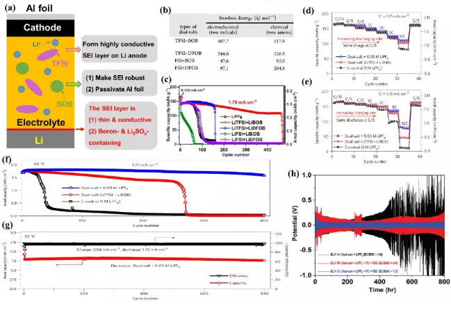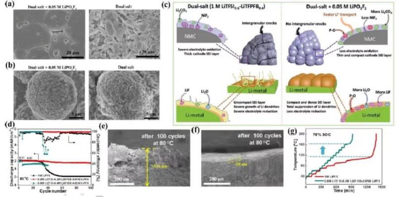 一些特殊的混合鹽電解質(zhì)采用了LiTFSI和LiBOB,設(shè)計用于鋰金屬電池的寬溫度范圍和超高溫。作者最近將LITFSI與自合成三氟鋰(全氟叔丁氧基)-硼酸酯(LITFFB)結(jié)合,以低熔點和高沸點碳酸鹽(PC和EMC)為主要溶劑,制備了一種二氟磷酸鋰(LiPO2F2)添加劑輔助的1 M電解質(zhì)。隨著混合鹽電解液中LITFFB用量的增加,可以有效地抑制LITFSI對鋁箔的腐蝕。添加LiPO2F2顯著提高了LiNi0.5Mn0.3Co0.2O2/Li (NMC532/Li) LMB的循環(huán)性能和倍率性能,其范圍從-40到90°C不等。在60°C時,發(fā)現(xiàn)LiPO2F2添加劑有助于在鋰金屬負(fù)極和NMC532正極的表面形成致密的保護性SEI層(圖7a-c)。H. Li等人使用EC和PC的高沸點/閃點溶劑,配制了一種0.8 M LITFSI/0.2 M LiDF6輔助的LiPF6混合鹽電解質(zhì)。由于鋰金屬負(fù)極的良好保護(圖7d-f),這種電解質(zhì)使LiCoO2/Li LMB在80℃的高溫下具有良好的可循環(huán)性。更有趣的是,2Ah LiCoO2/Li電池的加速速率量熱法(ARC)結(jié)果表明,這種混合鹽電解質(zhì)比LiPF6電解質(zhì)具有更好的熱穩(wěn)定性(圖7g)。
