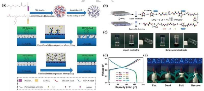 除了鋰離子電池和鋰金屬電池,作者還概括了其他類型電解質(zhì)的研究情況。Y. G. Guo等人通過原位聚合聚乙二醇二丙烯酸酯(PEGDA,有助于鋰離子遷移)和乙氧基化三羥甲基丙烷三丙烯酸酯(ETPTA,用作交聯(lián)劑),設(shè)計了剛性交聯(lián)的雙鹽(LITFSI/LiPF6)凝膠聚合物電解質(zhì)(GPE,纖維素作為剛性載體)。更重要的是,雙鹽3D GPE在室溫下具有0.56 mS cm-1的高離子導(dǎo)電性,并賦予鋰金屬表面一個堅固導(dǎo)電的SEI層,在LiFePO4/Li LMB中長期循環(huán)后,實現(xiàn)了均勻的鋰沉積且沒有明顯的枝晶生長。最近,有研究者通過在室溫下利用LiPF6和DOL之間的原位陽離子開環(huán)聚合,成功地獲得了一種工藝可行的新型準(zhǔn)固體GPE(LiTFSI/LiPF6、DOL/DME、聚二氧戊環(huán)(PDXL))(圖8b-c)。這種新型GPE對鋰負(fù)極的枝晶生長和粉化有有效的抑制作用,與低壓硫復(fù)合材料、LiFePO4、高壓(4.3 V)NCM 622等多種正極具有良好的相容性(圖8d-e,打破了傳統(tǒng)醚類的電壓限制)。因此,利用混合鹽、設(shè)計良好的聚合物基體和合適的溶劑尋找和設(shè)計GPE,將是鋰金屬保護和提高LMBs性能的重要方向。