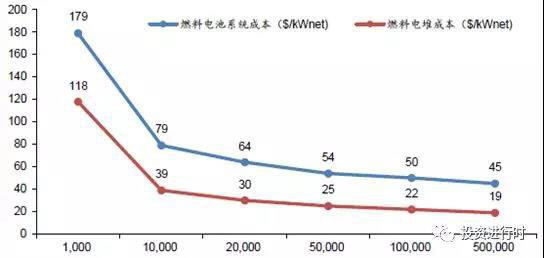 2017年美國燃料電池系統(tǒng)年產(chǎn)50萬套成本已從2006年的124美元/Kw下降到45美元/Kw,根據(jù)DOE《Fuel Cell System Cost–2017》的預(yù)測,2020年將下降到40美元/Kw。當(dāng)產(chǎn)量達到50萬臺套時,規(guī)模效應(yīng)將加速成本下降,燃料電池系統(tǒng)的成本將下降到45$/kWnet,電堆成本將下降到19$/kWnet。