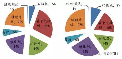 從燃料電池發(fā)動機成本構(gòu)成來看,以年產(chǎn)200套公交車為例,電堆成本占比70%(其中質(zhì)子交換膜27%、催化劑19%、擴散層19%、雙極板5%),輔助系統(tǒng)占比22%。