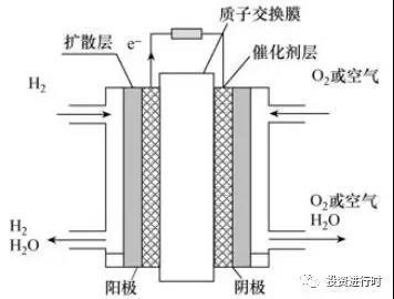 與鋰電池作為儲能裝置不同,氫燃料電池是一種非燃燒過程的能量轉(zhuǎn)換裝置,通過電化學(xué)反應(yīng)將陽極的氫氣和陰極的氧氣(空氣)的化學(xué)能轉(zhuǎn)化為電能。燃料電池結(jié)構(gòu)單元主要由膜電極組件和雙極板構(gòu)成,其中膜電極組件是由質(zhì)子交換膜、催化劑與氣體擴散層組合而成的,為反應(yīng)發(fā)生場所;雙極板是帶流道的金屬或石墨薄板,其主要作用是通過流場給膜電極組件輸送反應(yīng)氣體,同時收集和傳導(dǎo)電流并排出反應(yīng)產(chǎn)生的水和熱。