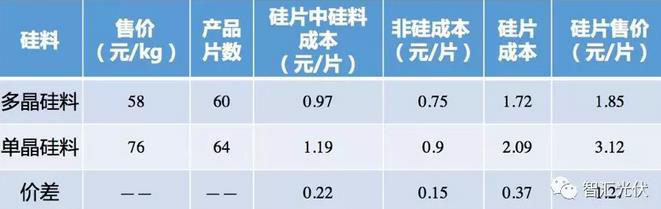 表2:單多晶硅片的成本分析