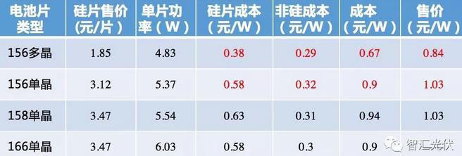 單多晶組件理論上應(yīng)該有0.18元/W以上的合理價差,但在目前的電池片的售價下,單多晶組件成本僅有0.09元/W的價差。因此,單晶組件成本優(yōu)勢明顯。