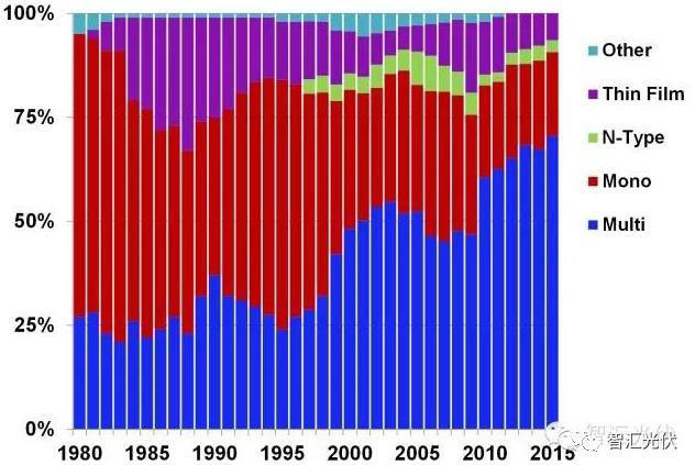 從歷史來看,單多晶組件的市場份額各領(lǐng)先過一段時間。早期是單晶為主,2000年以后隨著多晶成本降低,多晶逐漸成為市場主流;2017年金剛線切割大規(guī)模應(yīng)用之后,市場逐漸發(fā)生反轉(zhuǎn)。1980~2015年的單多晶市場份額如下圖所示。單晶、多晶、薄膜,沒有永遠(yuǎn)絕對好的技術(shù),只有某一階段最適合市場的技術(shù)!