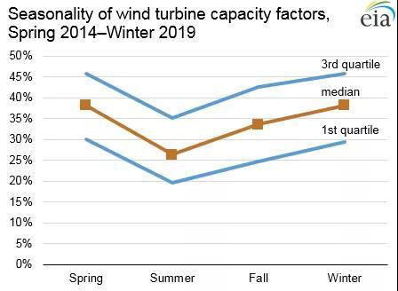 在全美范圍內(nèi),風(fēng)電廠(chǎng)容量系數(shù)往往是春季最高,到夏季下降約30%,然后在秋季中后期再次增加。2014年春季至2019年冬季,風(fēng)電容量系數(shù)的中位數(shù):春季38.2%、夏季26.4%、秋季33.6%、冬季的38.1%。