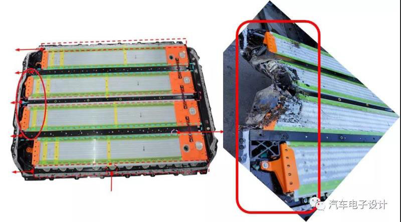 在事故中等于最惡劣的情況,底盤前面的部分沒有防護(hù)好,正面有物理直接往電池系統(tǒng)前方切開前面的保護(hù),讓前部的電芯受到了直接的力,整個電池系統(tǒng)的結(jié)構(gòu)防護(hù)給破壞,物理直接對著電芯就施加了擠壓力。