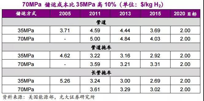 根據(jù)美國(guó)能源局(DOE)研究數(shù)據(jù),自2005年以來長(zhǎng)管拖車儲(chǔ)運(yùn)成本下降幅度最大,35MPa由2005年的5.26$/kgH2下降到2015年的2.69$/kgH2,但同期與70MPa相比成本高出10%左右。